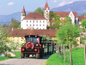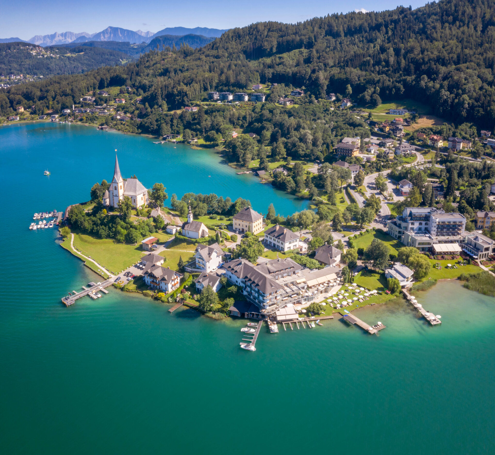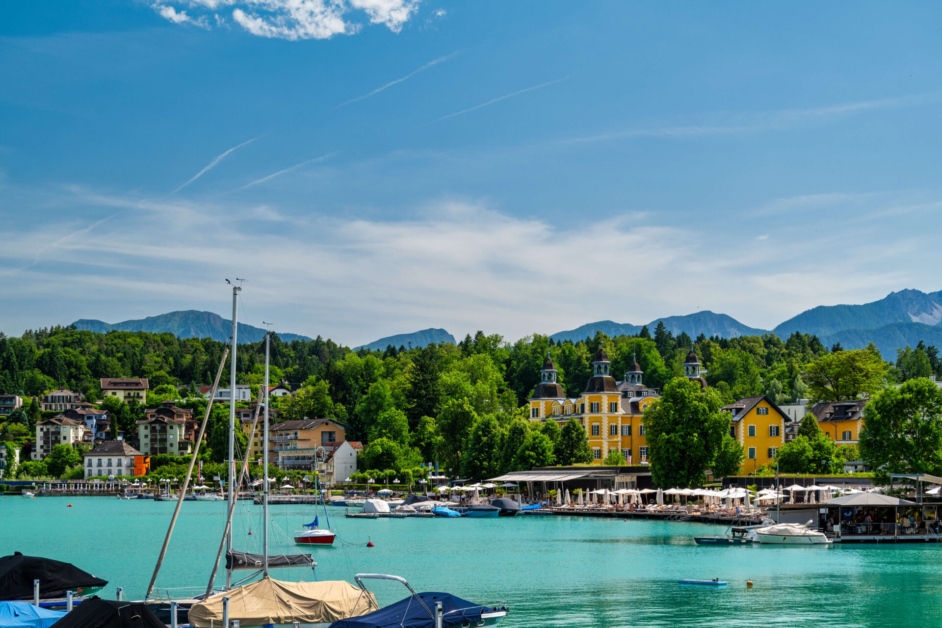 Ausflug in die Veldener Bucht am Wörthersee. Ein Blickfang ist das Schlosshotel Velden – ein historisches Juwel aus dem 19. Jahrhundert. Vielleicht ist auch Ihnen dieses noch als Schauplatz der Fernsehserie „Ein Schlosshotel am Wörthersee“ bekannt. Flanieren Sie auf der Promenade am See entlang, blicken auf den türkisfarbenen See und bestaunen die malerische Landschaft.